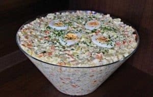 Zutaten 1 Tasse – 250 ml/g 1 Tasse Salatgurken, geschält und gewürfelt 1 Tasse Zwiebeln, gewürfelt 1 Tasse Mayo 1 Tasse Kartoffeln, gewürfelt, gekochte 1 Tasse Schinken, gekochter, gewürfelt 1…