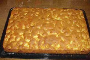 Zutaten 220 g Zucker 5 Eier 1 Paket Vanillinzucker 320 g Mehl 220 g Butter 1 Paket Backpulver 1,5 kg Äpfel, gewürfelt Puderzucker Zubereitung Zuerst die Butter erhitzen und beiseite…