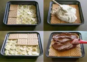 ZUTATEN 2 Pck.Puddingpulver mit Vanille-Geschmack 700 mlkalte Milch 1/3 TasseErdnussbutter (kann weggelassen werden) 240 mlSchlagsahne 27 St.(Vollkorn-)Butterkekse 3Bananen 60 gSchokolade 2 TassenPuderzucker 1/4 TasseButter 1 TLVanilleextrakt 2 ELMilch ,ZUBEREITUNG Puddingpulver…