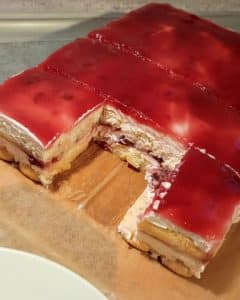 Zutaten: Löffelbiskuits 500 gr Quark 500 ml Schlagsahne 2 Päckchen Sahnesteif 5-6 El Zucker 1 El Speisestärke Milch 1 großes Glas Sauerkirschen Form ca 20×30 cm Zubereitung: Für die Creme…