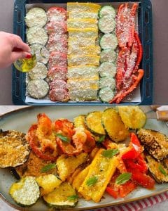 Zutaten 1 Aubergine 1 Grüne Zucchini 1 Gelbe Zucchini 1 Paprika 1 Ochsenherz-Tomate Semmelbrösel oder Panko Geriebener Parmesan aromatische Kräuter (nach Geschmack) Olivenöl extra Zubereitung Auberginen, Tomaten, Zucchini und Paprika…