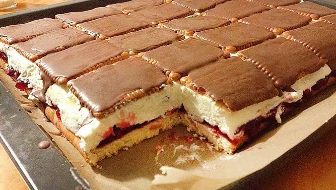 Jetzt die Preiselbeeren auf der Oberfläche des Biskuitkuchens gleichmäßig verteilen. Die Sahne mit Sahnesteif steif schlagen und damit den Kuchen bestreichen. Die Butterkekse einzeln kurz in den Rum tauchen, anschließend gleichmäßig, dicht und vollständig die Sahne damit abdecken.