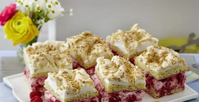 6. Baiserplatte in 8–10 Stücke schneiden. Ca. 30 Minuten auskühlen lassen.