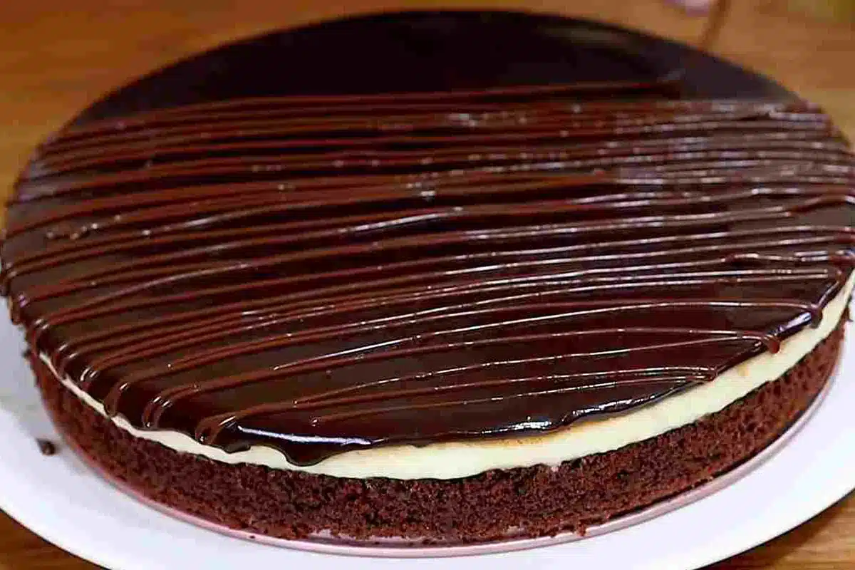 4. Nun die Sahne bei milder Hitze erwärmen, aber nicht kochen. Wenn sie warm ist, sofort vom Herd nehmen, die in Stücke gebrochene Schokolade hineingeben und unter Rühren schmelzen. Als letztes die Glasur anschließend auf dem abgekühlten Pudding verteilen. Den Kuchen Kalt stellen und danach servieren.