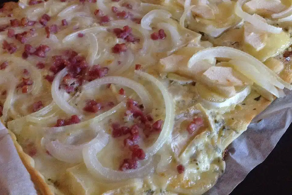 Flammkuchen mit Ziegenkäse – eine köstliche Abwandlung des Elsässer Klassikers, die mit Ziegenkäse und würzigen Zutaten begeistert.