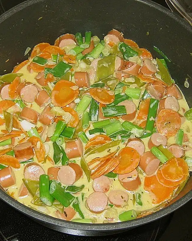 - Frühlingszwiebeln zu den Kartoffeln geben, kurz anbraten dann mit der Sahne ablöschen, Senf zugeben, mit Salz und Pfeffer kräftig abschmecken, zum Ende der Garzeit Erbsen, Möhren und Würstchen dazugeben, alles noch mal gut durchziehen lassen.