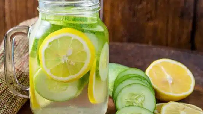 Gurke und Zitrone gründlich waschen (man schält sie nicht). Nachdem sie gewaschen wurden, schneiden Sie sie in Scheiben und stellen Sie sie in ein Glas. Waschen Sie die Minzblätter und legen Sie sie ebenfalls in das Glas. Den geriebenen Ingwer hinzufügen. Das Wasser in das Glas gießen und 8 Stunden lang in den Kühlschrank stellen. Gelegentlich umrühren, damit alle Antioxidantien und Nährstoffe im Wasser austreten. Trinken Sie es jeden Tag und genießen Sie es!