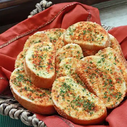 Als leztes schneiden Sie das Brot in Scheiben und jede Scheibe mit dem vorbereiteten Knoblauchaufstrich verteilen. Nun legen Sie die Brotscheiben auf ein mit Öl gefettetes Backblech und Zum Schluss bei 241°C ca. 3 bis 4 Min backen (auf Grillfunktion).