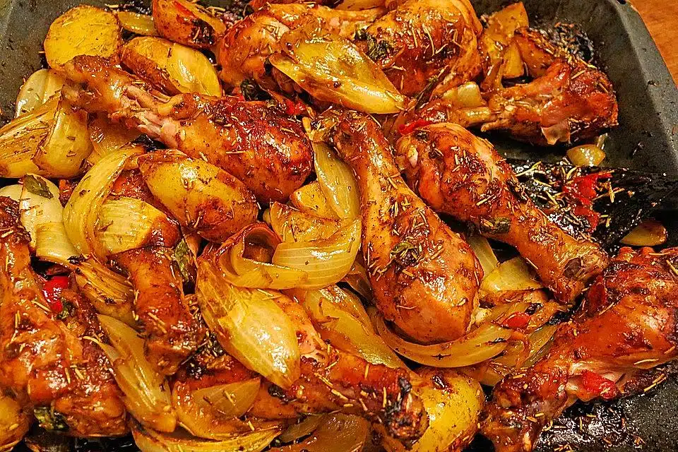 Alles zu den Hähnchenkeulen geben. Evtl. alles zwischendurch mal mit der Bratflüssigkeit beträufeln.