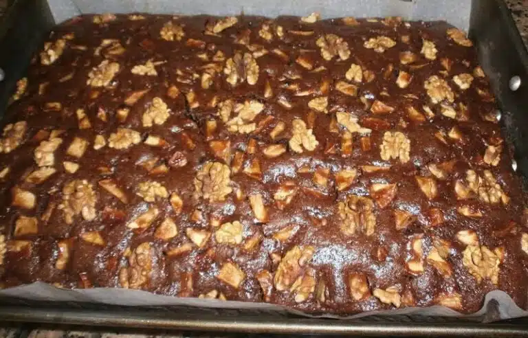1. Als erstes die Eier und Zucker schaumig rühren, portionsweise die Milch, die zerlassene Butter und die Trockenmischung (Mehl, Back- und Kakaopulver, gehackte Walnüsse) dazugeben.