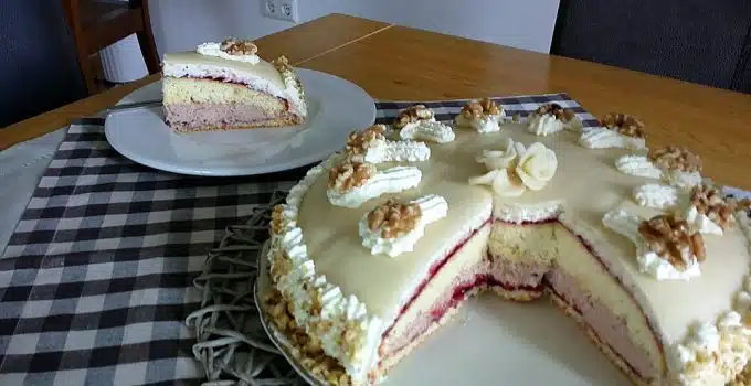 Den unteren Boden mit Hälfte der Nusssahne einstreichen. Den zweiten Boden draufsetzen und mit Johannisbeerkonfitüre einstreichen. Die Torte mit der restlichen Nusssahne rundherum einstreichen.