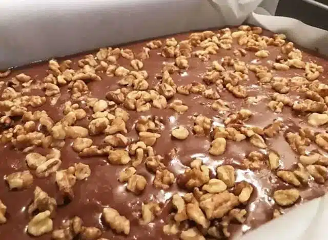 - Die Oberseite mit gehackten Walnüssen bestreuen und in den auf 180 °C vorgeheizten Backofen schieben.