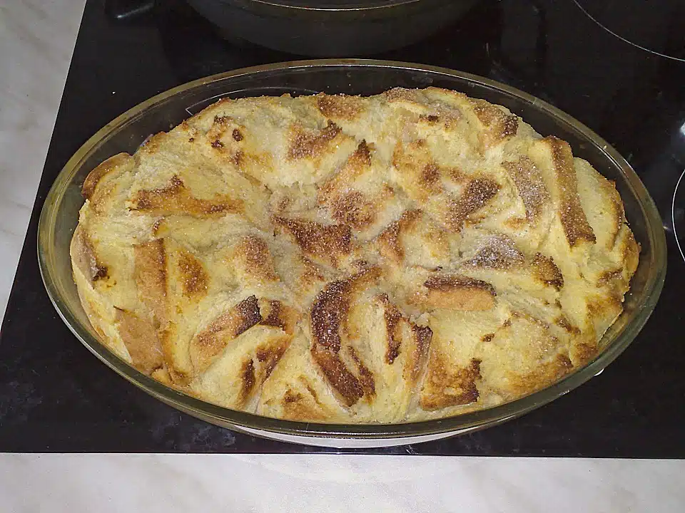 Die Eier mit der Milch in einer Auflaufform verrühren, dann den Zucker hinzufügen, ebenfalls gut unterrühren. Dann die Weißbrotscheiben hinlegen und zwar so, dass die gesamte Form ausgelegt ist. Bei einer runden Form einfach 2 Scheiben in Stücke reißen und an die Ränder legen. Dann mit einer Gabel vorsichtig die Weißbrotscheiben nach unten drücken, so ziehen sie schneller durch.