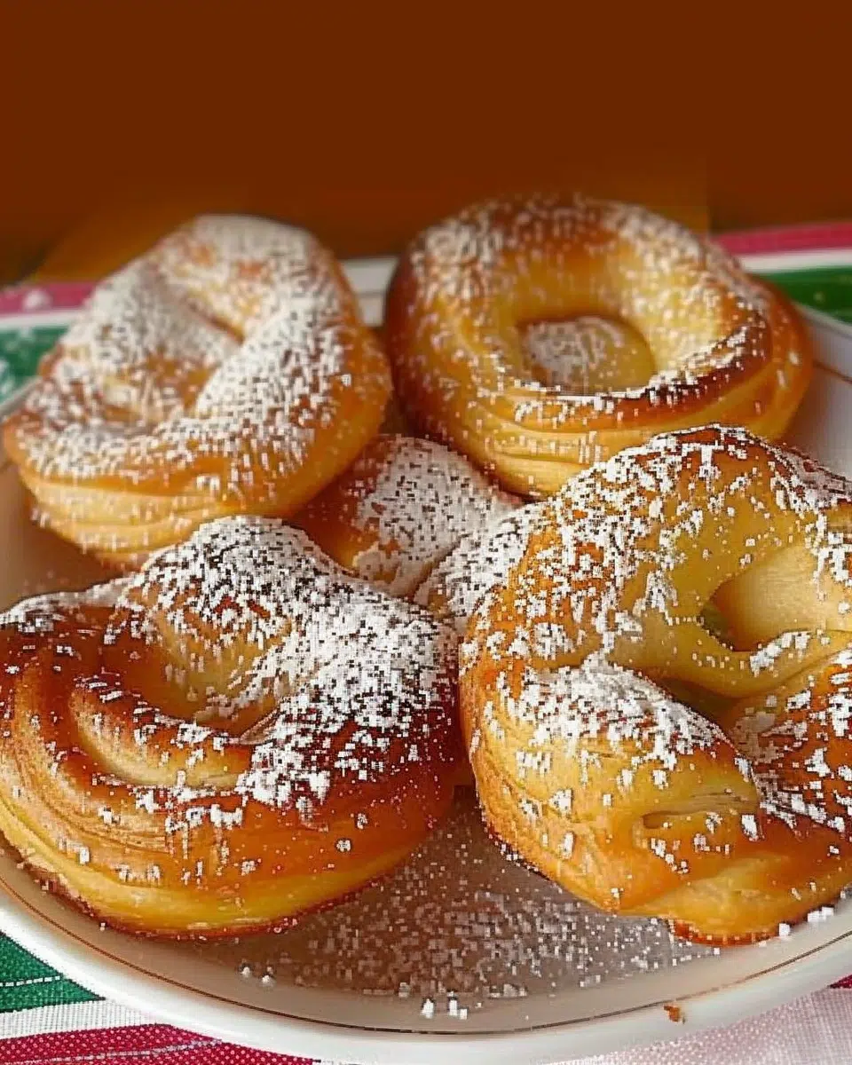 Die Teiglinge in der Mitte dünn ausziehen, ohne dass ein Loch entsteht und außen ein 2 cm breiter Rand bleibt. Man gibt sie schwimmend in heißes Ausbackfett, gießt mit einem EL heißes Fett über die Mitte, damit sie nicht einfallen, und backt sie goldgelb. Auf einem Küchentuch abtropfen lassen. Noch warm mit Puderzucker oder Zimtzucker bestreuen.