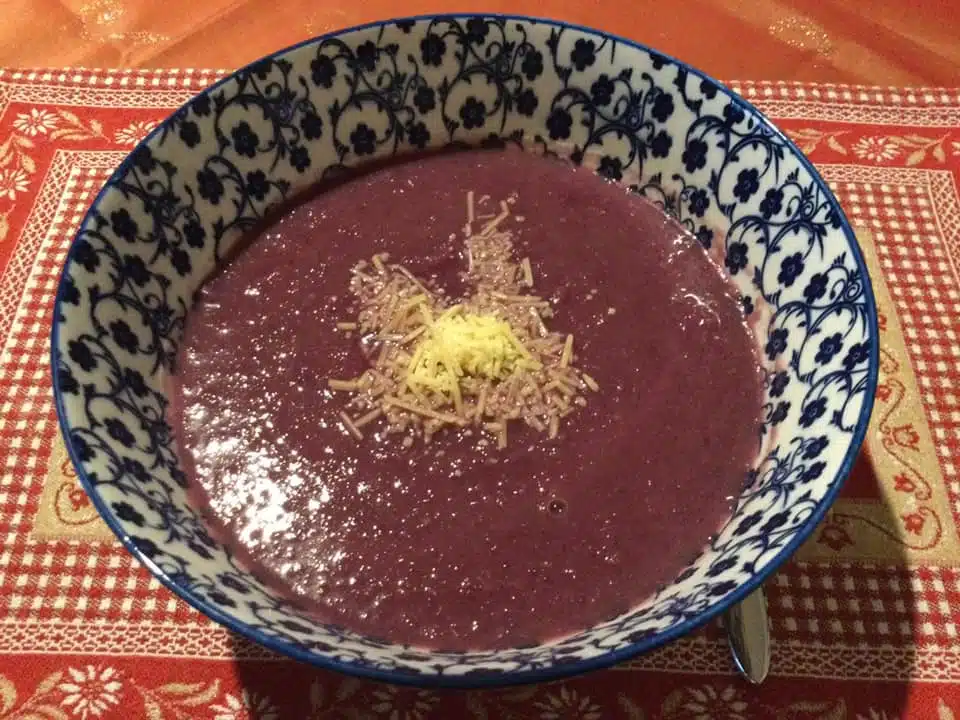 Rotkohl vom Strunk entfernen und in streifen schneiden🎄Schalotten, Knoblauch, Apfel, Kartoffel schälen und fein würfeln🎄Olivenöl in einem Topf erhitzen und darin alles anschwitzen🎄mit Rotweinessig ablöschen, mit Wasser aufgießen, den Brühwürfel dazugeben und abgedeckt ca. 30 min. köcheln lassen, nach Belieben würzen und die Suppe pürieren🎄wer mag, vor dem anrichten, etwas geriebenen Parmesan darüber streuen🎄