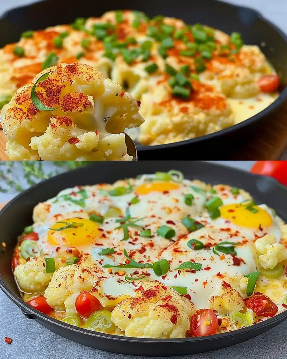 Den Blumenkohl in ein Sieb abgießen und abtropfen lassen. Auf Tellern oder einer Platte anrichten und das Dressing darüber geben. Die Eier darauf anrichten und mit den restlichen Kräutern bestreut servieren.
