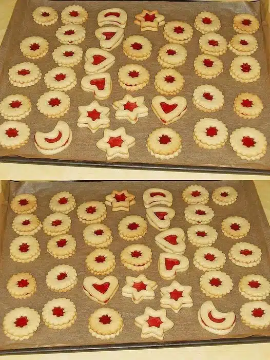 Nach dem Abkühlen auf die Hälfte ohne Loch eine säuerliche Marmelade (z.B. Johannisbeer) streichen und die andere Hälfte mit Loch oben auf setzen.