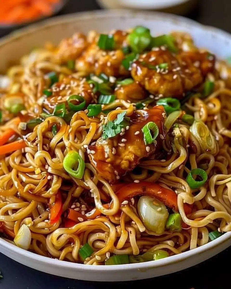 Chinesisch gebratene Nudeln mit Hühnchenfleisch, Ei und Gemüse