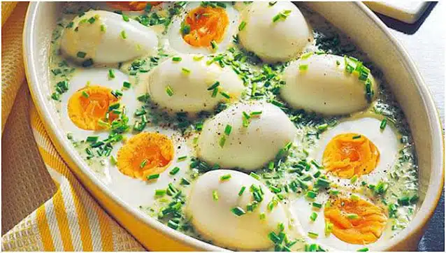 Nun geben Sie Eier wachsweich kochen zu der Soße. Nach Belieben gibt noch ausgelassene Speckwürfel dazu. Als letztes mit Petersilie bestreuen