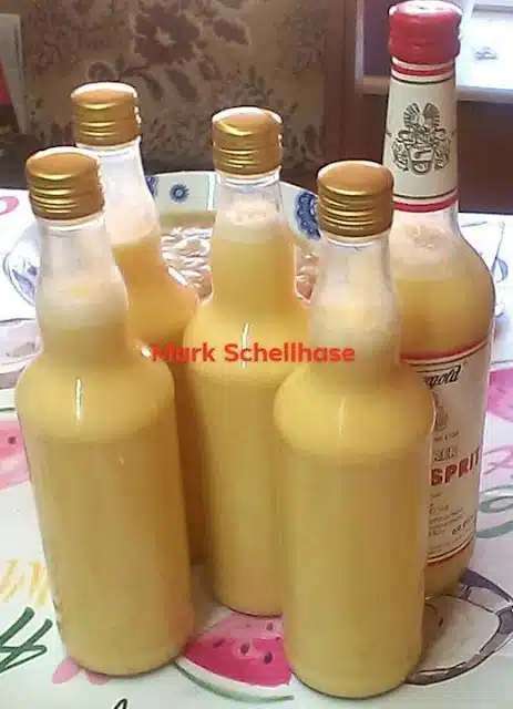 Jetzt 1 größeren Topf (ca. 5 L) nehmen,1/2 L Milch, 750 ml Kaffeesahne, 2 Pck Vanillezucker, 1 Flasche Prima Sprit alles mischen. allmählich den Puderzucker unterheben.Und nochmal vermischen. Ganz zum Schluss die 20 Eigelb dazu geben und danach nochmals alles schön mischen. Als letztes mit einem Trichter den Eierlikör in die Flaschen füllen.