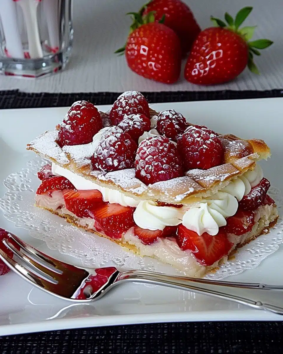 Dann wird die Sahne geschlagen und zum Schluss noch die Paradiescreme untergerührt, die Vanillesahne in einen Spritzbeutel mit großer Sterntülle füllen und von den Quadraten mit einem scharfen Messer einen Deckel abschneiden, die Sahne dekorativ aufspritzen und die Erdbeeren darauf verteilen, den Deckel wieder auflegen und mit Puderzucker leicht bestäuben.