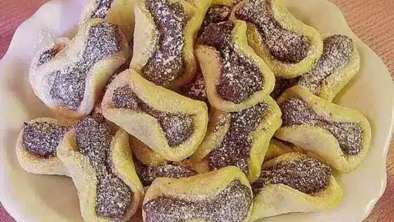 - Mit Glas runde Plätzchen ausstechen, in die Mitte z.B. Marmelade geben und die Plätzchen wie für Piroggen zusammendrücken.