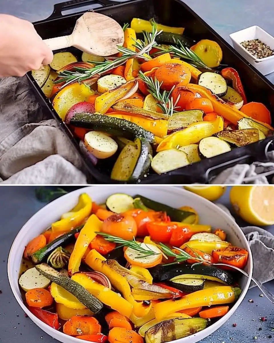 Rosmarin waschen, trocken schütteln und Nadeln fein hacken. Mit Kartoffeln, Bohnen, Tomaten, Zwiebeln und Zucchini mischen, in eine Auflaufform geben, mit Salz und Pfeffer würzen und mit Olivenöl beträufeln. Brühe zugießen, noch einmal mischen und im vorgeheizten Backofen bei 200 °C (Umluft 180 °C; Gas: Stufe 3) etwa 30 Minuten backen, dabei ab und zu umrühren.