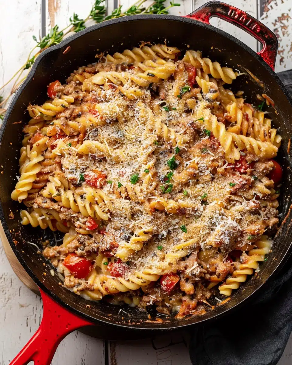 Hackpfanne mit Hörnchennudeln und Gemüse
