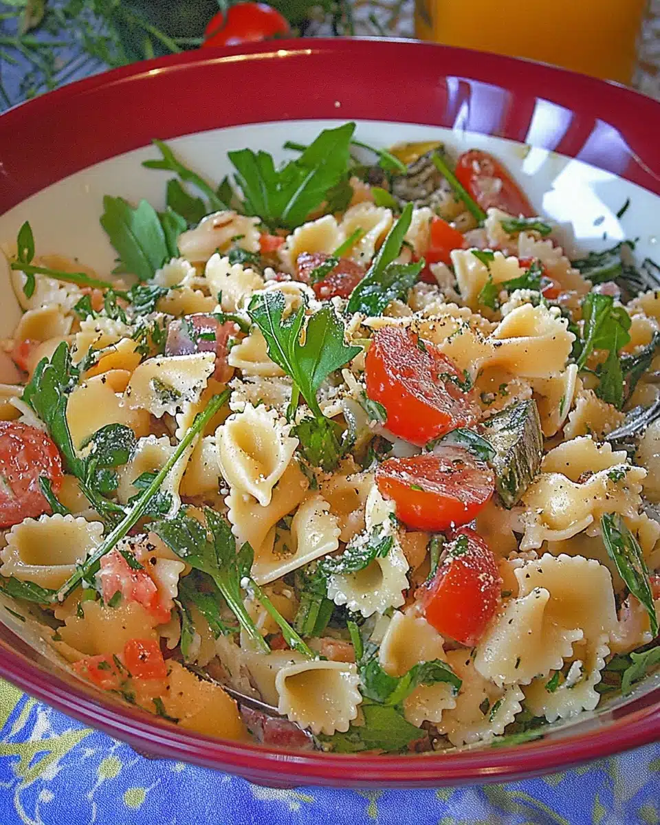 Die Pinienkerne ohne Fett und bei mittlerer Hitze in der Pfanne leicht anbräunen. Rucola waschen, trocken schleudern und zerkleinern. Die getrockneten Tomaten und den Mozzarella abtropfen lassen und würfeln. Den Parma- oder Kochschinken in zarte Streifen schneiden. Der Schinken kann auch am Stück gekauft werden, dann bitte würfeln. Die Zutaten in eine große Schüssel geben, vorsichtig durchmischen, salzen und pfeffern.
