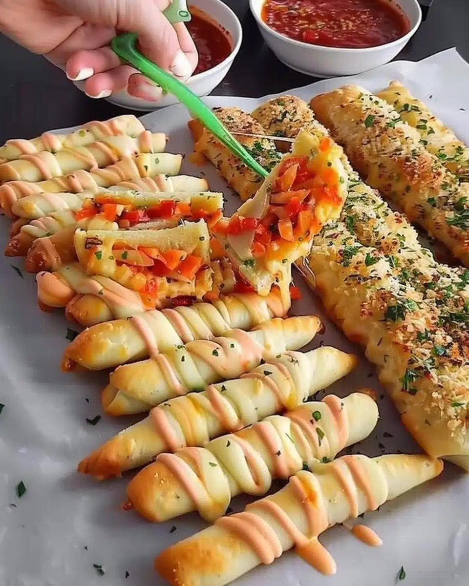 Den Blätterteig in 12 gleichmäßige Teile schneiden. Eigelb und Milch verquirlen, etwas davon auf den Blätterteig geben und mit dem Tomatenmark bestreichen. Den Emmentaler gleichmäßig darauf verteilen. Zu Stangen zusammenrollen. Mit dem restlichen Eigelb bestreichen, dann mit dem Meersalz, Kümmel, Paprikapulver, Oregano nach Belieben bestreuen. Die Stangen auf ein mit Backpapier ausgelegtes Backblech geben.