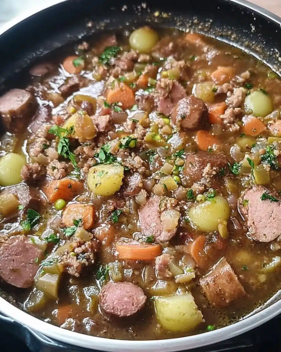 Ca. 10 Minuten vor Ende der Garzeit die Würstchen in Scheiben schneiden und beifügen. Mit Salz, Pfeffer und Essig abschmecken.