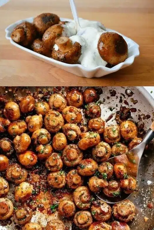 Champignons in eine Pfanne geben bei höchster Hitze ohne Öl 5 Minuten anrösten. 1 Prise Salz, die Butter und 1 TL Öl hinzufügen. Zwiebeln dazugeben und die Hitze auf die mittlere Stufe stellen. Das Ganze nochmal für 1 – 2 Minuten braten und mit den Paprikapulvern und dem Pfeffer würzen.