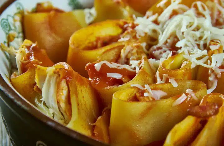 Jetzt mache ich das Öl heiß , und gebe den Zucker dazu zum Karamelisieren . Danach gebe ich den gefürfelten Zwiebel dazu und rühre alle um , bis der Zwiebel glasig wird . Jetzt hebe ich den geschnittenen Spitzkohl unter . Jetzt Dünste ich ihn bis er Durch und Bräunlich ist . In der Zwischenzeit hab ich die Schinkenwürfel kross angebraten . Nun gebe ich die Bandnudeln und die Schinkenwürfel dazu . Rühre alles um gebe noch Pfeffer aus der Mühle und den Kümmel dazu , und lasse es noch kurz Köcheln.