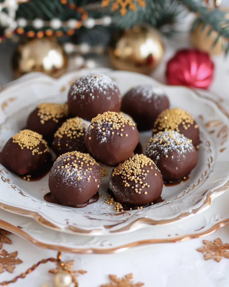 Die Kugeln nacheinander mit Hilfe einer Trempiergabel in die Kuvertüre/Schokolade eintauchen, abklopfen, Unterseite am Schüsselrand abstreifen und auf Backpapier oder Alufolie setzen. Trocknen lassen.