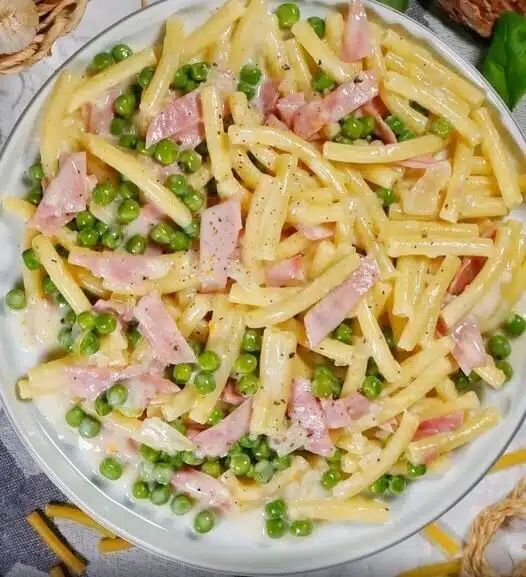 Jetzt Schinken dazugeben und mitbraten. Salzen und Pfeffern. Gemüsebrühe und Sahne angießen und Erbsen ebenfalls untermischen.