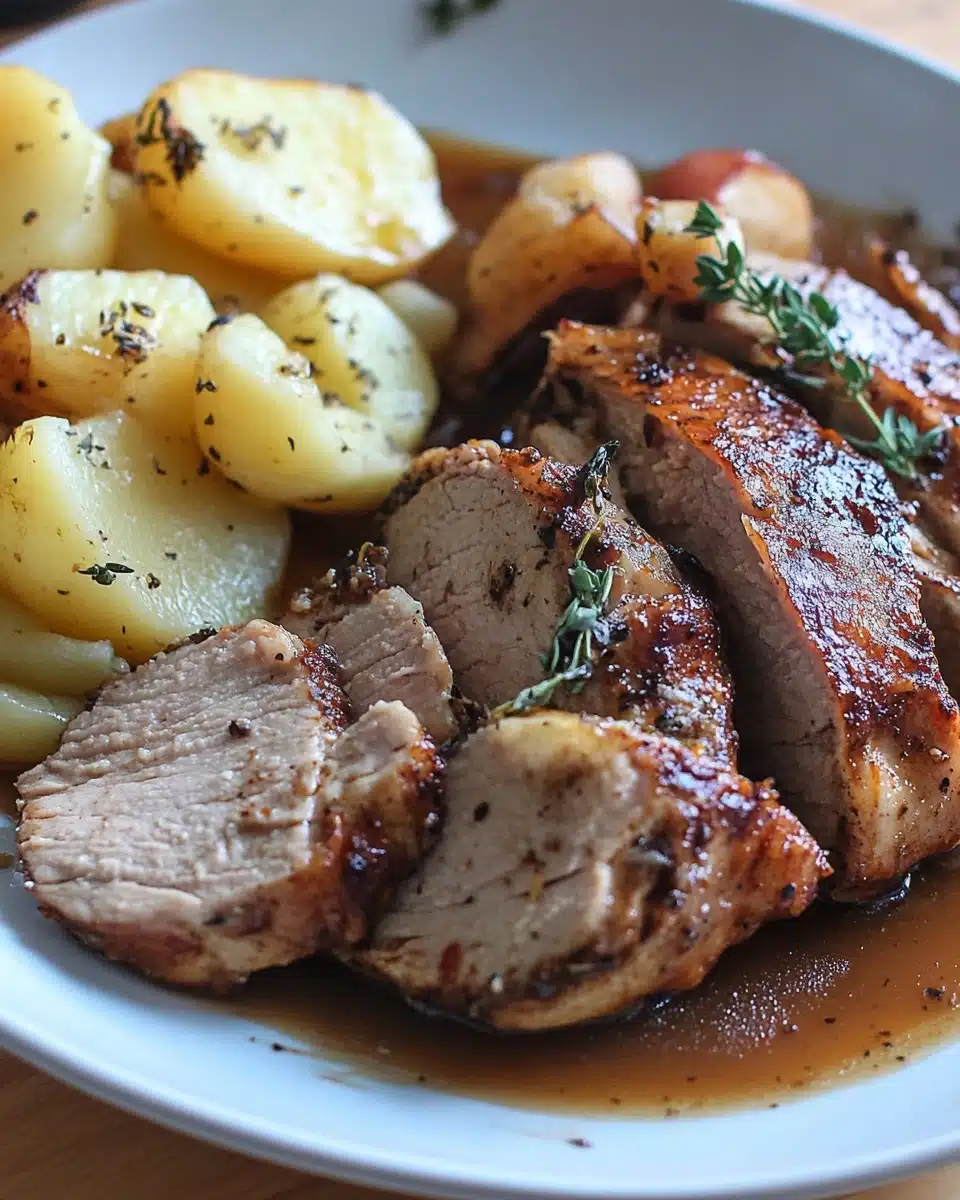 Das Fleisch aus dem Topf nehmen, in Alufolie wickeln und so warm halten. Den Fond durch ein feines Sieb gießen, den Sahneersatz bwz. Sahne hinzugeben und erneut zum Kochen bringen. Die Speisestärke mit etwas Wasser anrühren, zur Sauce geben und damit abbinden. Eventuell noch einmal mit Salz und Pfeffer abschmecken. Heiß servieren.