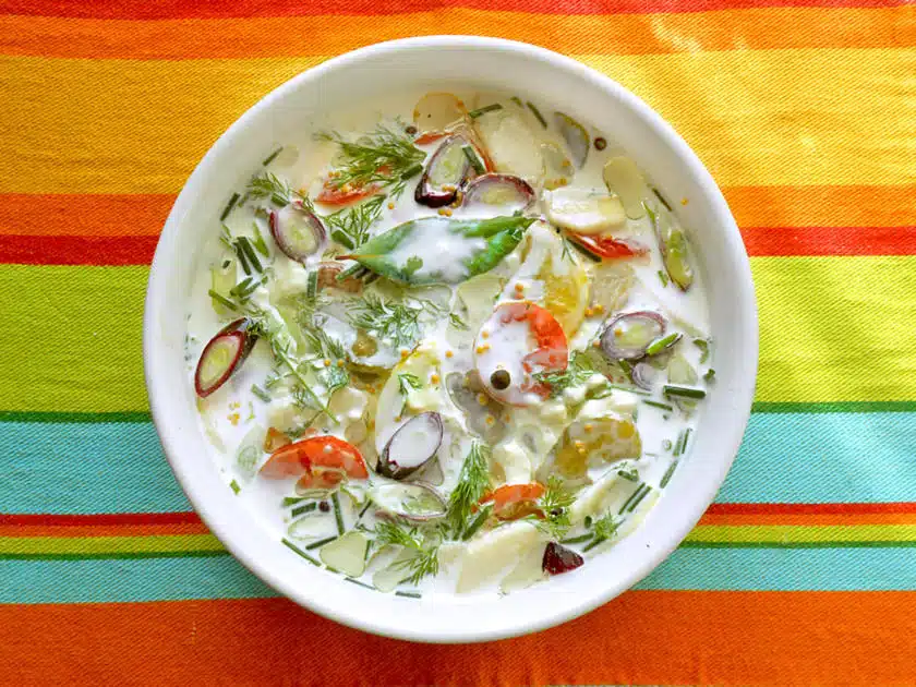 4.Aus Mayonnaise, saurer Sahne und Milch eine Marinade rühren. Mit ein bis zwei Esslöffel Zitrone würzen und behutsam salzen. Die Marinade über die eingelegten Matjes-Heringe gießen. Mit etwas Sonnenblumenöl beträufeln.
