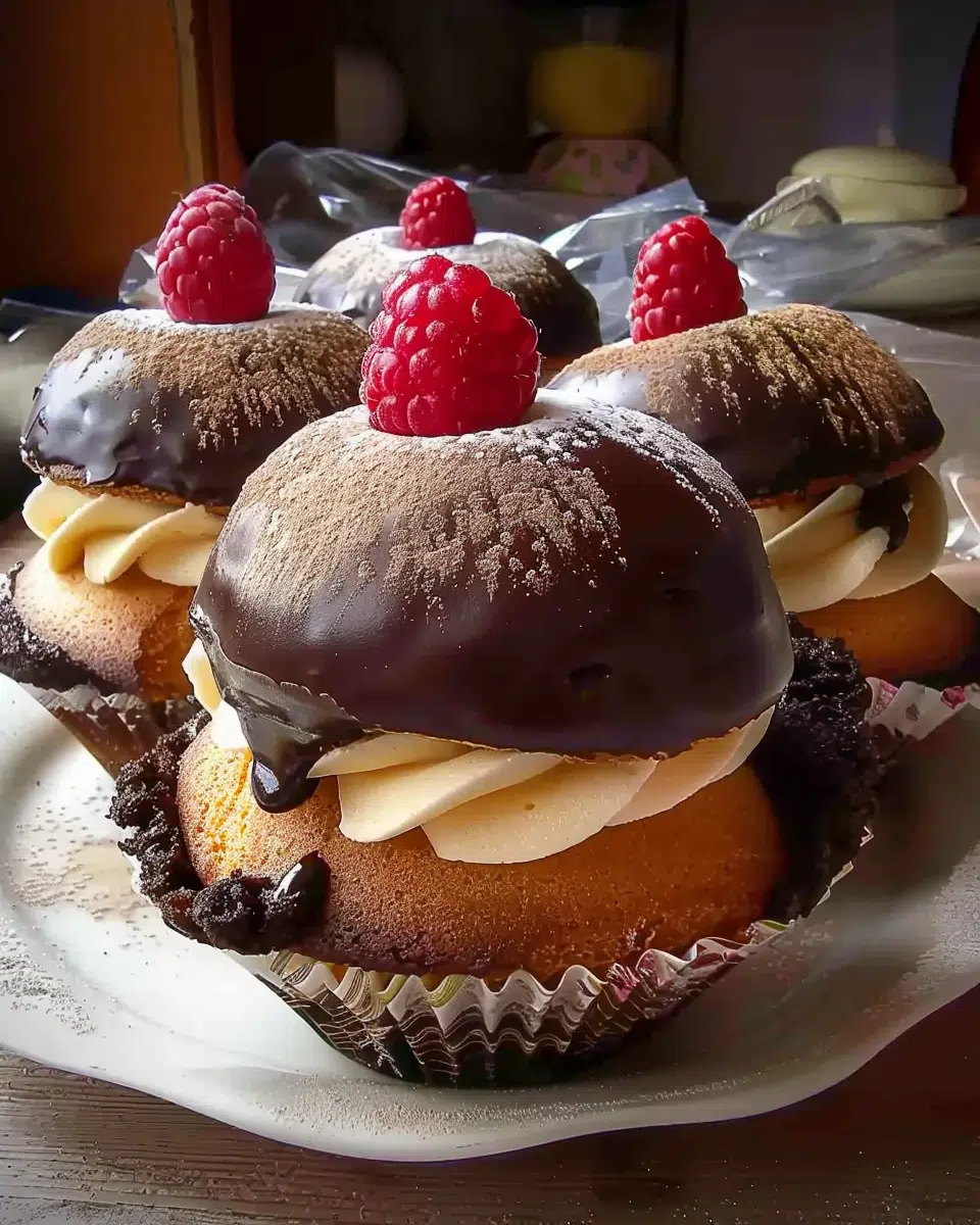 Buttercreme auf dem Boden der Kuchen verteilen, den Schokoladendeckel darauf setzen. Im Kühlschrank lagern.