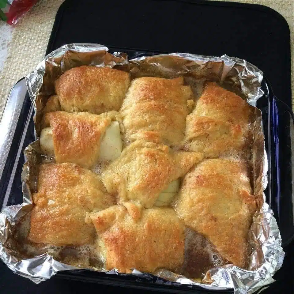 Ein geschälter Apfel wird entkernt und mit Butter, Zimt und Zucker gefüllt, dann in einer Teigkruste gerollt und mit einer butterartigen braunen Zuckersauce beträufelt, bis er goldbraun gebacken ist.