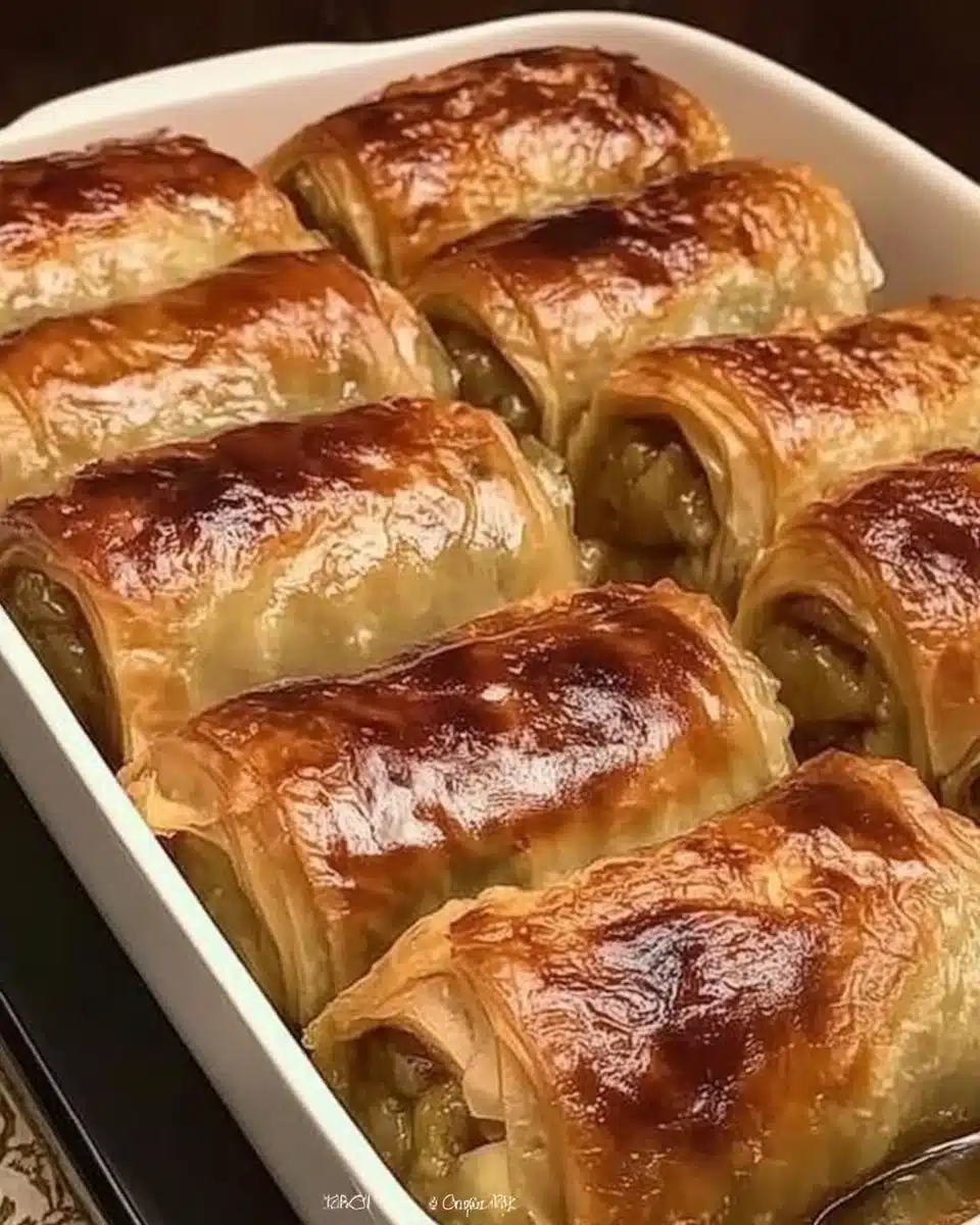 3. Jetzt zwei bis drei (je nach Größe) Blätter überlappend aufeinanderlegen und in die Mitte einen Klecks der Hackfleischmasse geben. Zusammenfalten und die Rouladen mit Garn, wie Päckchen zusammenbinden.