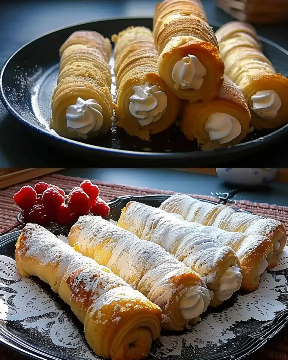 - Servieren: Die gefüllten Schaumrollen mit Puderzucker bestäuben und servieren.