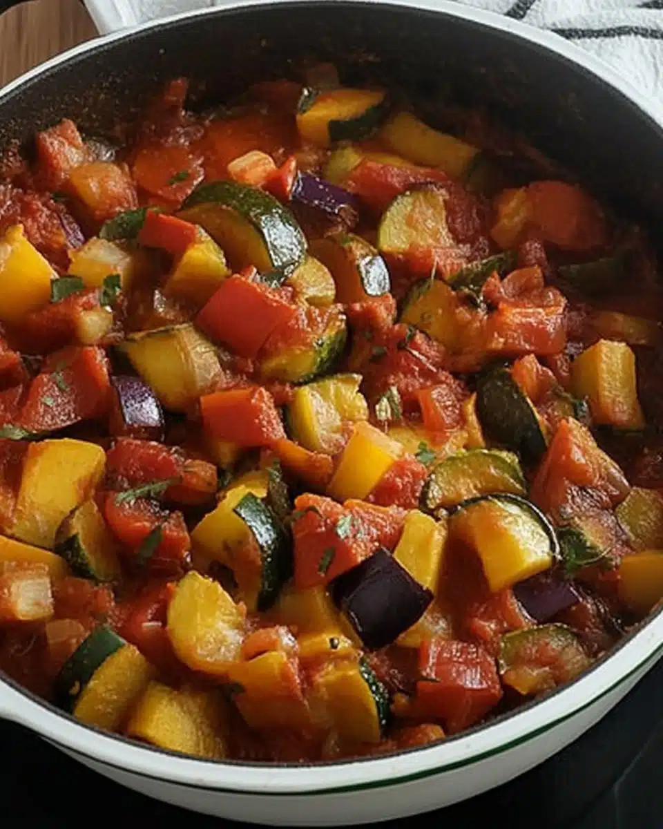 In einer großen Pfanne mit hohem Rand das Olivenöl erhitzen. Zwiebeln und Zucchini darin anbraten, Paprika zugeben und als Letztes die Aubergine zufügen. Alles etwa 5 Minuten kräftig braten. Das Tomatenmark zugeben und unterrühren, salzen und pfeffern. Knoblauch und Kräuter sowie geschälte Tomaten und Zucker dazugeben. Den Herd auf mittlere Flamme stellen und das Ratatouille etwa 20 Minuten köcheln lassen. Wenn nötig, etwas Wasser zufügen. Das Gemüse sollte noch etwas Biss haben.