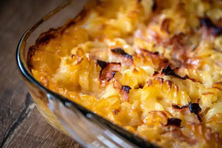 4.Zuletzt den Auflauf nach 25 Minuten herausnehmen und die Crème fraîche-Käsemischung auf den Auflauf geben und für weitere 10 Minuten im Backofen überbacken, bis der Auflauf goldgelb ist. Schnell und lecker!