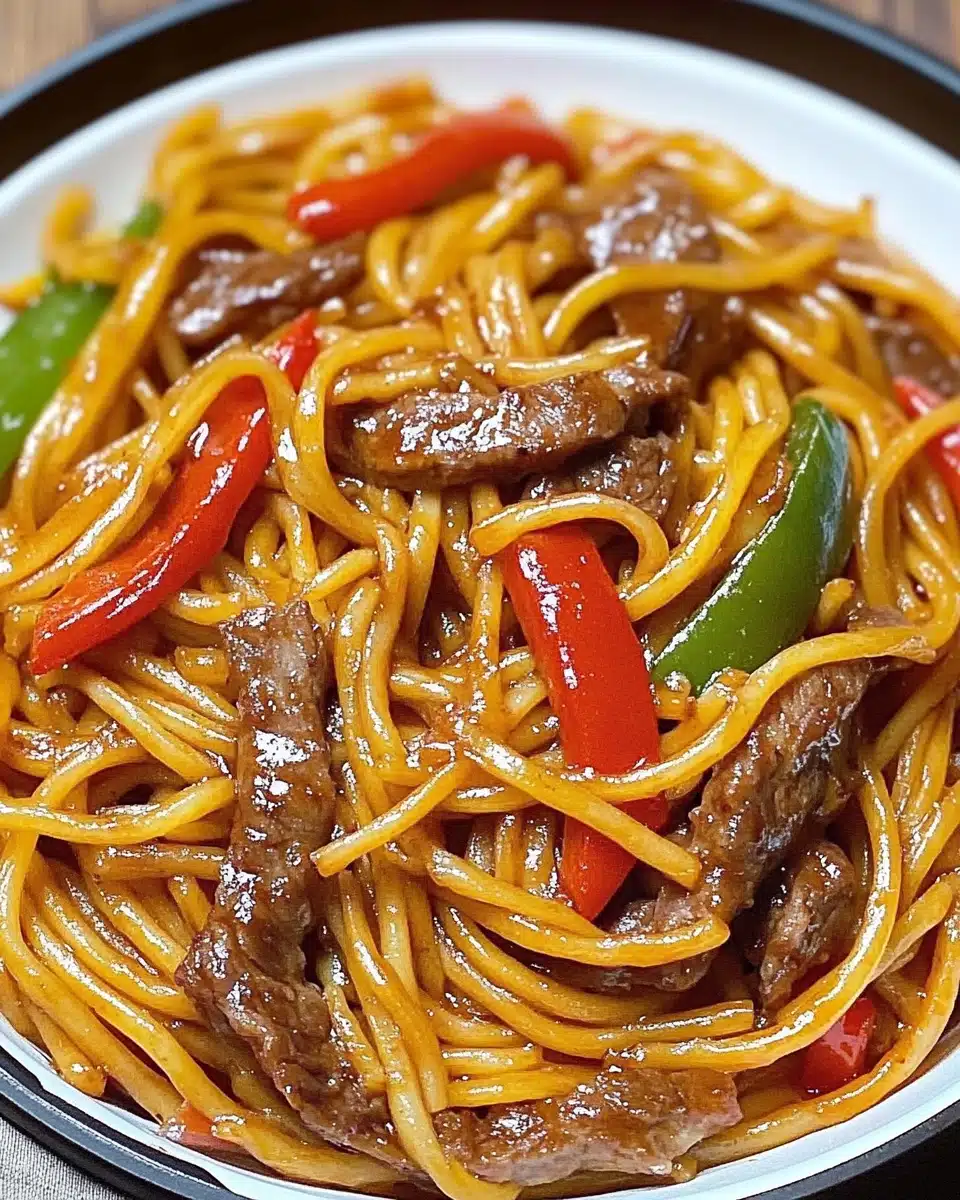 Rindfleisch mit Paprika, Zwiebeln und Nudeln