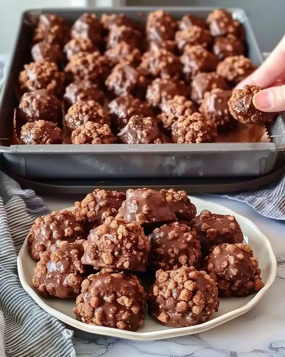 Die Schokolade in einem Dampfgarer schmelzen. Die Kugeln in die Schokolade tauchen und den Überschuss abtropfen lassen. Legen Sie sie auf ein mit Pergamentpapier ausgelegtes Tablett. Warten Sie eine Stunde, bis sie bereit sind