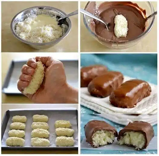 1. Einfach mal die Kokosraspel und Kondensmilch zu eine Masse verarbeiten und ca. 10 – 15 Min. in den Kühlschrank stellen. Dann mit angefeuchteten Händen Kugeln in gewünschter Größe formen.