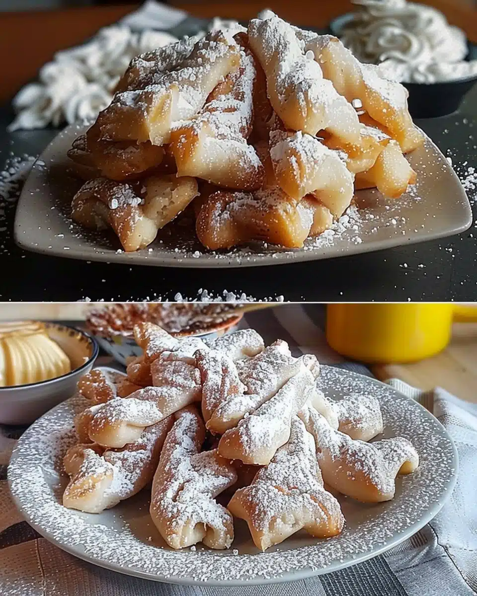 4. Als nachstes das Fett erhitzen und Faworki/Gebäck von beiden Seiten goldgelb darin ausbacken. Auf Küchentuch abtropfen. Noch warm mit Puderzucker, gemischt mit Vanillinzucker, dick bestäuben.