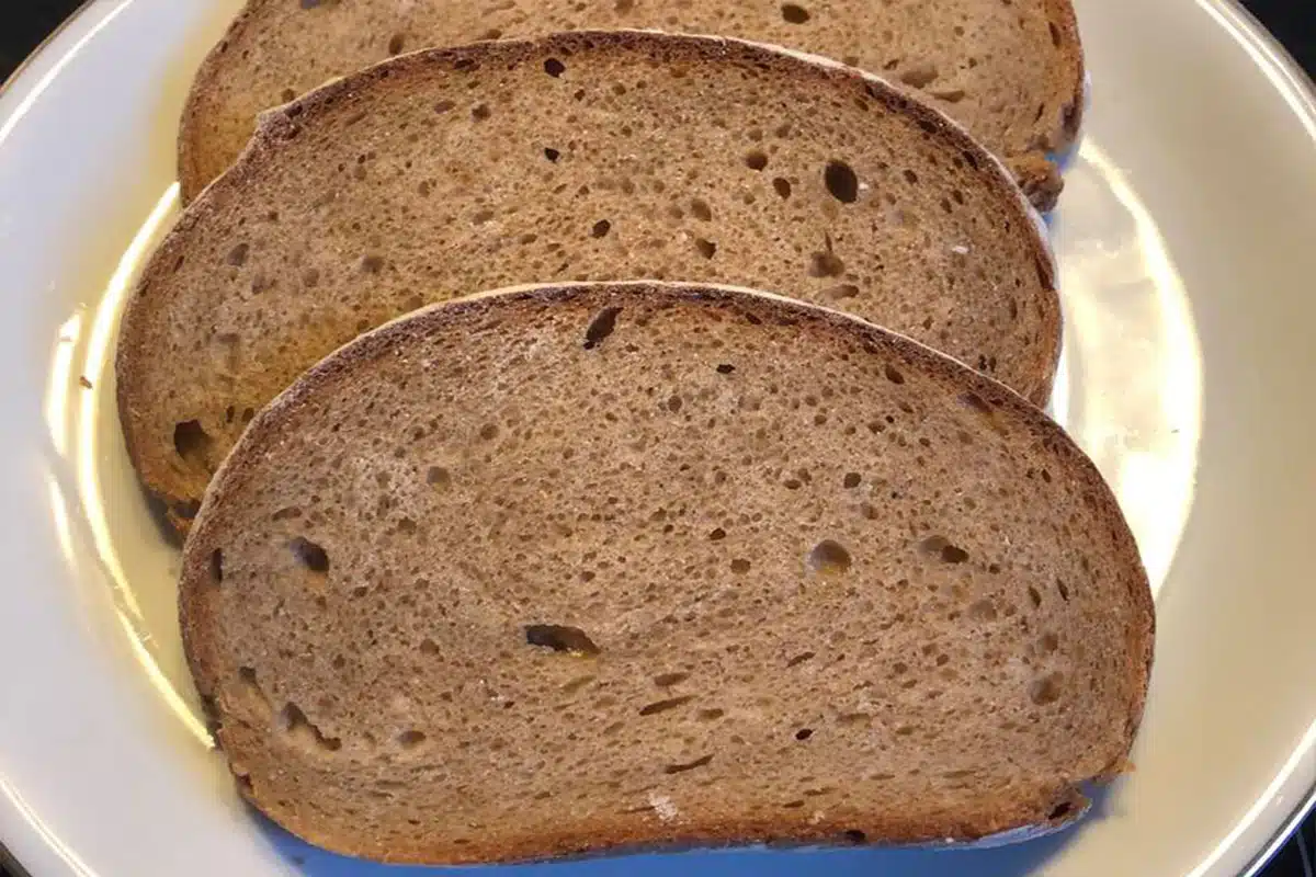 5.Nach ca. 35 Min. das Wassergefäß aus dem Ofen nehmen, den restlichen Dampf entweichen lassen und das Brot noch ca. 20 Min. backen. Wenn das Brot fertig ist kann man es hören. Man nimmt das Brot in die Hand und klopft auf die Unterseite, sollte es sich hohl anhören ist es fertig und kann auf einem Kuchengitter auskühlen.