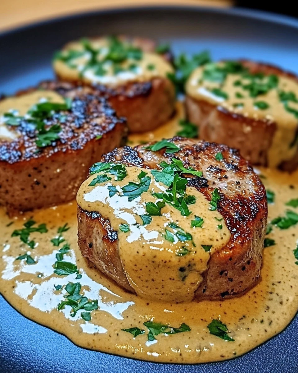 Zarte Schweinemedaillons in Senf-Sahnesauce