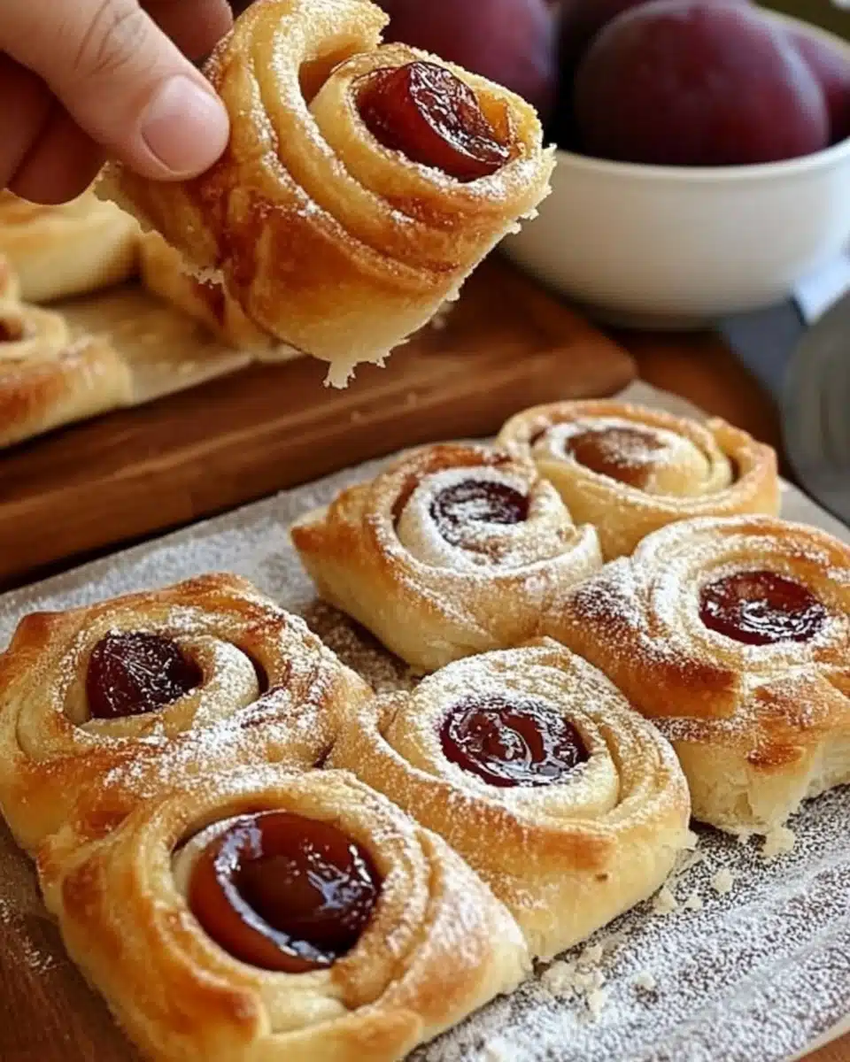 Zuletzt die Zwetschgenschnecken im heißen Backofen auf der mittleren Schiene etwa 30 Minuten backen, dann herausnehmen, auskühlen lassen und genießen.